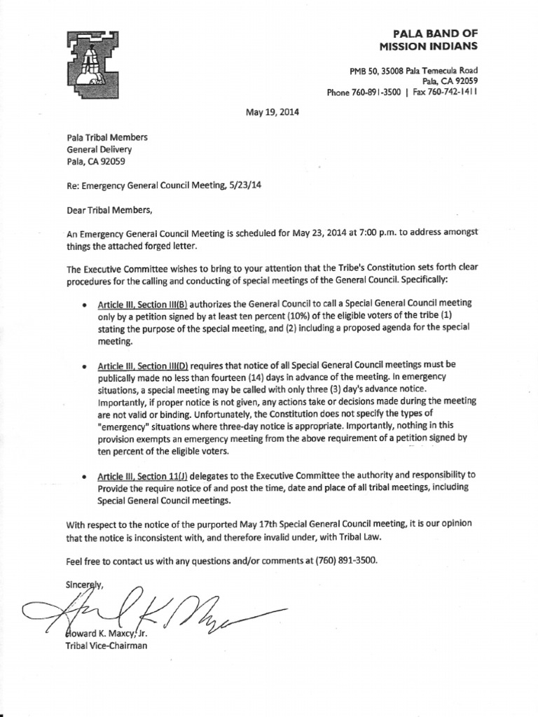 2014 May 19 Howard Maxcy Notice Emergency Meeting